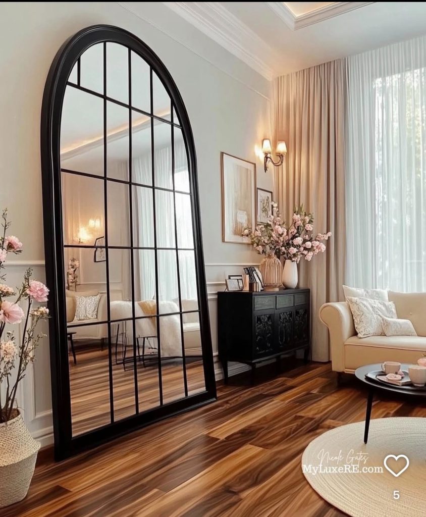 Place it in a corner or lean it next to your fireplace if you have one. It will reflect light, open up the room visually, and add a gorgeous architectural element that makes the whole space feel more curated.